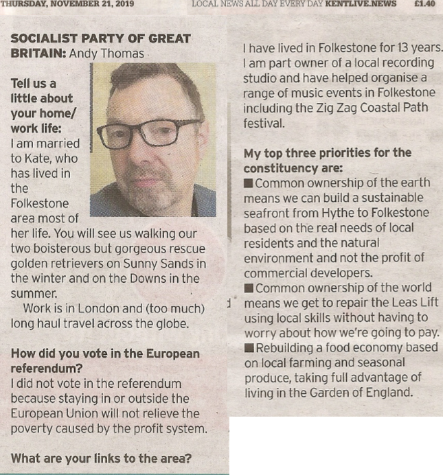 ParticipantA pre-recorded interview with Andy Thomas, SPGB candidate in Folkestone & Hythe, was shown on BBC South East Today, this afternoon, following the candidates representing the Conservatives, Greens, Lib Dems and Labour being questioned together, live, by the programme’s host. http://www.facebook.com/socialistpartyofgreatbritain/videos/1831499256994149/ (recorded from a TV).