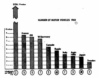 Far in excess of all of them, of course, is the United States, with the fantastic total of 80 million vehicles. The effects of this are, however, localised and in many areas one measures the number of square miles to the car and not the other way round. But the problem is no easier in the built-up areas where most of the population is concentrated, in fact, it is often much worse. Los Angeles, and similar towns, stand as terrible warnings of what the unrestrained advance of the motor car can do to man and his way of life.