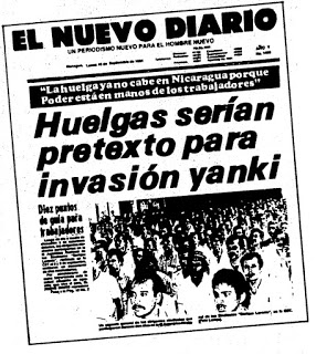 currency (to buy machinery and arms), rather than allowing them to grow food to feed themselves. Thus, they are forced to brigade the workers into state-controlled “trade unions” and to denounce strikes as counter-revolutionary. In this respect, see the front page we reproduce here of of an official Sandinist newspaper whose headline reads: STRIKES WOULD BE AN EXCUSE FOR A YANKEE INVASION! The subtitle in white on black reads: “The strike is not necessary in Nicaragua because power is in the hands of the workers”, exactly the same argument used by the rulers of state capitalist Russia and East Europe. In reality it is precisely the fact that the workers in Nicaragua have to sell their ability to work to an employer, private or state, for a wage or salary that shows both that they don’t exercise power and that they need the strike weapon to defend themselves.