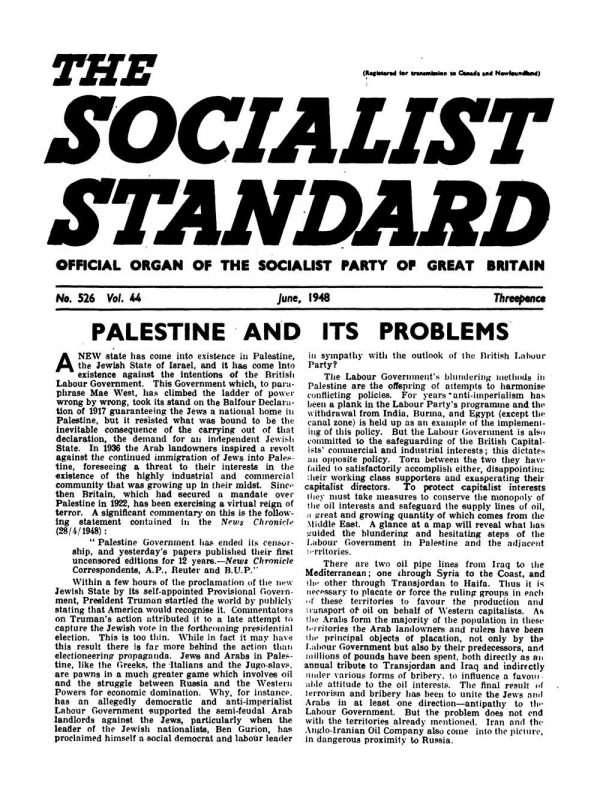 Within a few hours of the proclamation of the new Jewish State by its self-appointed Provisional Government, President Truman startled the world by publicly stating that America would recognise it. Commentators of Truman’s action attributed it to a late attempt to capture the Jewish vote in the forthcoming presidential election. This is too thin. While in fact it may have this result there is far more behind the action than electioneering propaganda. Jews and Arabs in Palestine, like the Greeks, the Italians and the Jugo-slavs, are pawns in a much greater game which involves oil and the struggle between Russia and the Western Powers for economic domination. Why, for instance, has an allegedly democratic and anti-imperialist Labour Government in Britain supported the semi-feudal Arab landlords against the Jews, particularly when the leader of the Jewish nationalists, Ben Gurion, has proclaimed himself a social democrat and labour leader in sympathy with the outlook of the British Labour Party?
